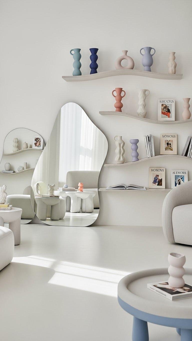 If you want a room that feels airy and a touch mischievous, bring in curved mirrors and wavy shelves to soften corners and catch the light. You’ll love how soft reflections bounce color around, while flowing silhouettes create movement without clutter. Mix sculptural vases and open books, lean mirrors casually, and let curves steer the room’s rhythm for a liberated, modern vibe.