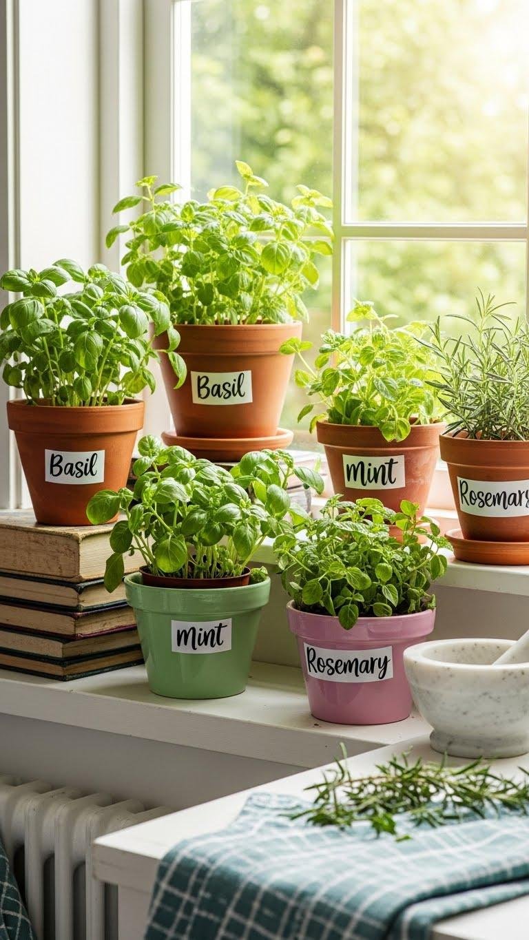 Create a windowsill garden with mismatched terracotta and pastel pots, label herbs in playful fonts, and keep a mortar nearby. Let basil, mint, and rosemary form an aromatic centerpiece that’s lively, unfussy, and invites spontaneous chopping, sipping, and sharing.