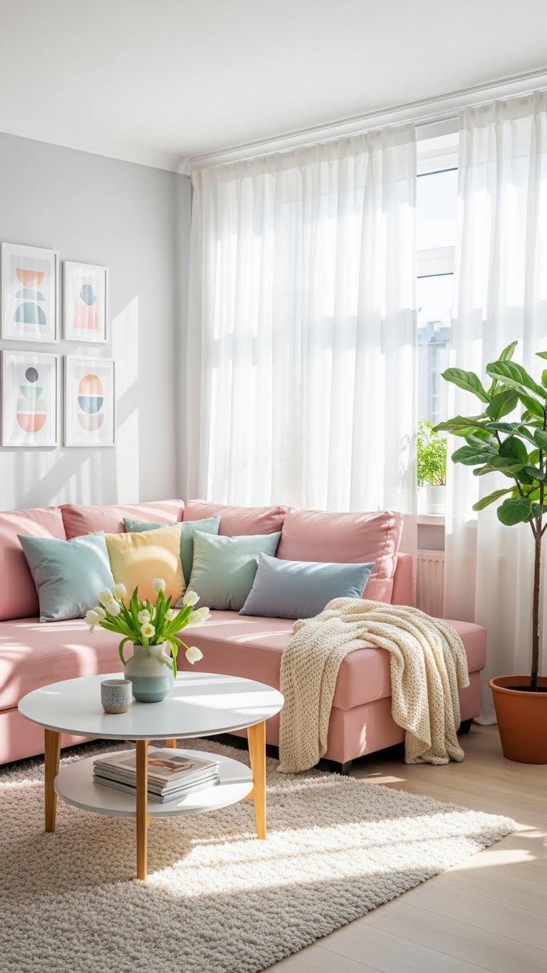 Now that your sofa’s swathed in soft pastels, let the windows breathe the same way by swapping heavy drapes for sheer, light-filtering curtains. You’ll choose voile curtains or gauzy sheer panels to soften sunbeams, enjoy gentle light diffusion, and keep airy privacy without feeling boxed in.
