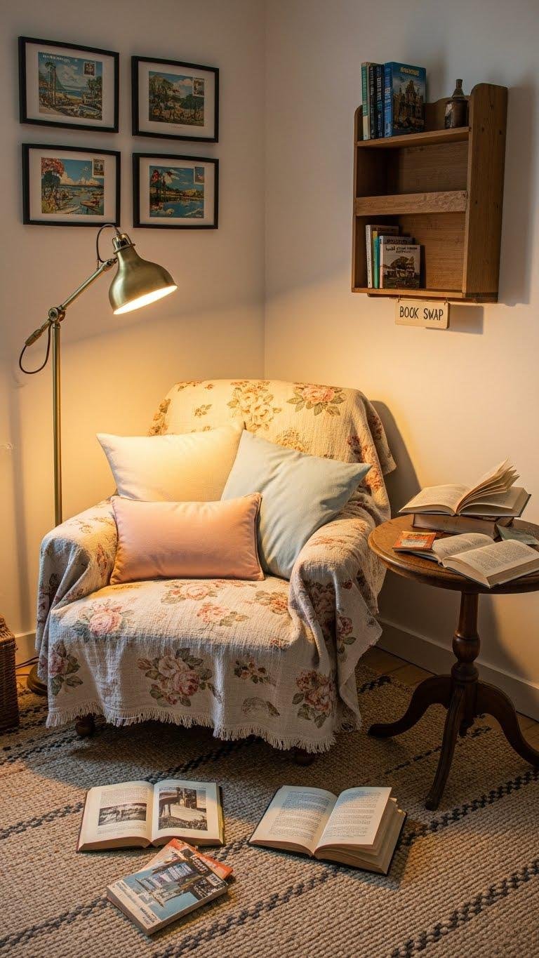 Curl up in a nook that feels like a tender memory you get to revisit: mix a well-loved armchair with a faded floral throw, tuck in a brass lamp with a soft, warm bulb, and scatter a few thrifted paperbacks and a framed postcard or two to anchor the scene. Add an antique lamp, woven rug, pastel cushions, and a mini shelf for a regular book swap—keep it light, liberated, joyful.