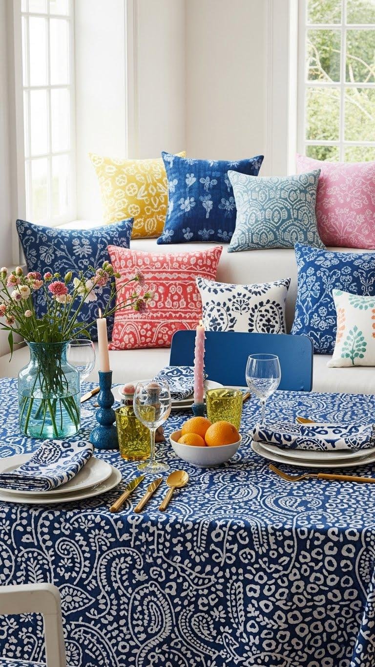 Why not let hand-stamped block prints steal the show? You’ll toss hand blocked pillows across a sunlit sofa, mix indigo motifs with soft pastels, and set a lively table with matching linens. Embrace bold patterns that feel free, artisanal, and modern — swap rigid formality for playful layers, easy textures, and a curated, wanderlust-ready vibe that refreshes spring without fuss.