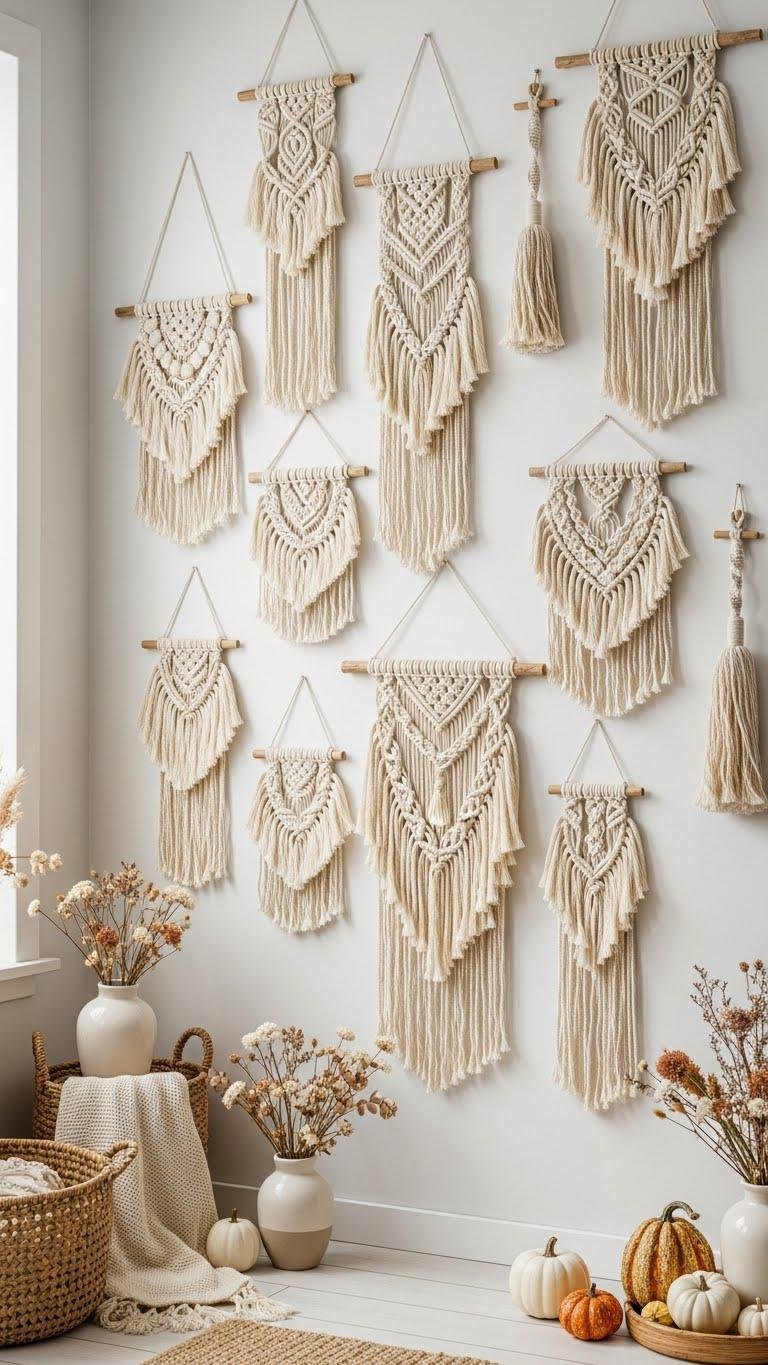Bring in a touch of artisan calm by hanging macramé wall pieces that pair knotty textures with the soft, breathable look of undyed cotton. You’ll mix hand knotted textures with neutral dyed fibers for contrast, letting layered fringes and airy loops soften corners.