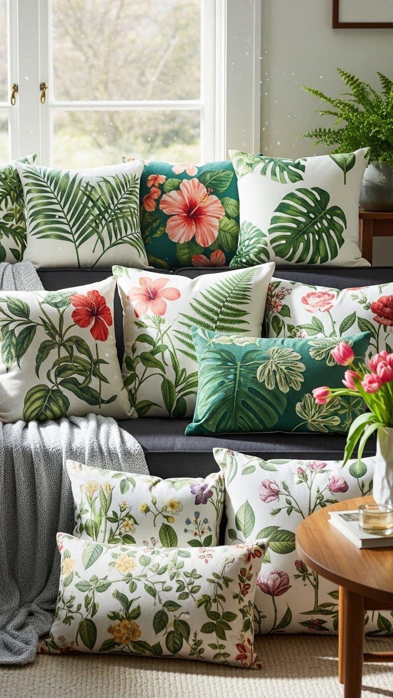 Bring in botanical-print throw pillows to ground your spring scheme and add effortless pattern without heavy commitment. Choose pillows with tropical motifs for bold, freeing accents or select vintage botanicals for subtle, lived-in charm. Mix scales and textures—linen, velvet, embroidered—to keep the look layered but light. Swap covers seasonally so you control mood without permanent changes.