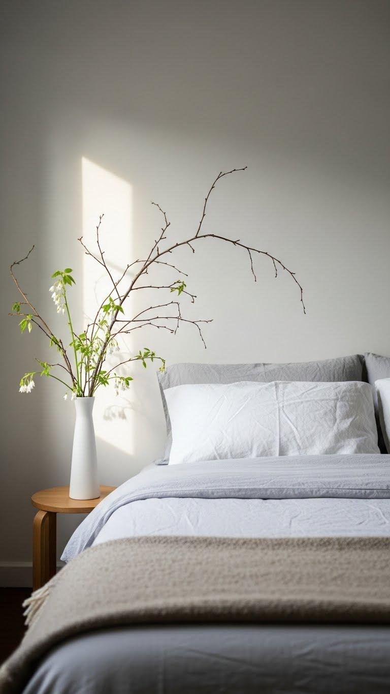 Bring in foraged branches or delicate blooming cuttings in minimal vases or wrapped bundles. You’ll enjoy seasonal scent and sculptural lines without clutter. Rotate stems as they fade, pair with light linens, and keep arrangements sparse to maintain a liberated, airy feel that’s effortlessly personal.