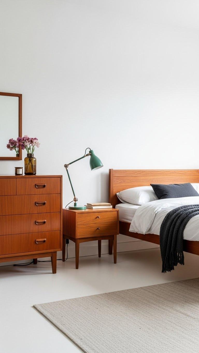 You’ll pair a vintage lacquer dresser with a streamlined teak revival bed, balancing shine with warm wood grain. Choose simple linens, open negative space, and a restrained palette so each statement piece breathes.