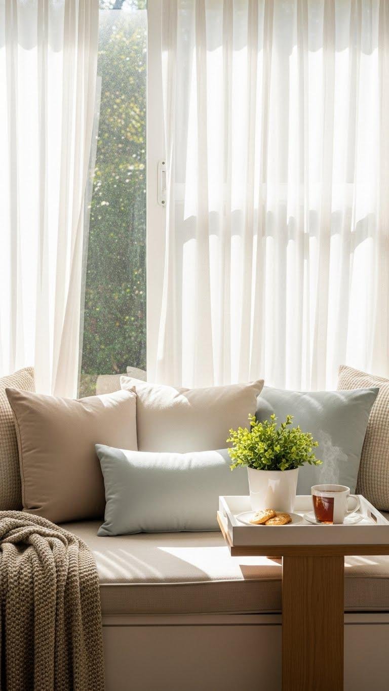 Keep accessories minimal — a small plant, a tray for tea — so your window seat feels free and uncluttered.
