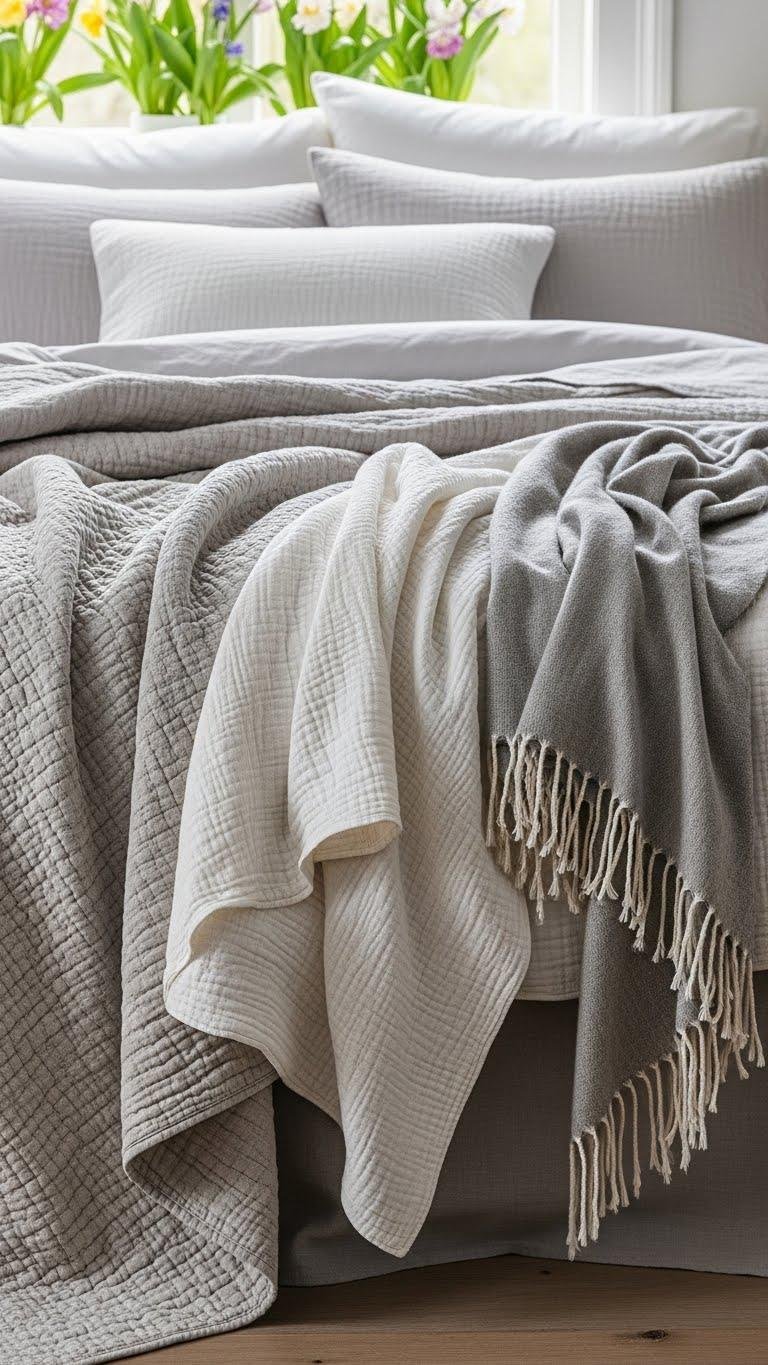 When spring brings cooler nights, layer lightweight quilts and throws to add warmth without bulk. You’ll mix linen layers with breathable textures—think gauzy cotton, thin wool, or open-weave throws—to create a relaxed, airy bed. Drape a quilt at the foot, toss a throw casually, and let pieces be interchangeable so you can move freely and adjust warmth as evenings shift.