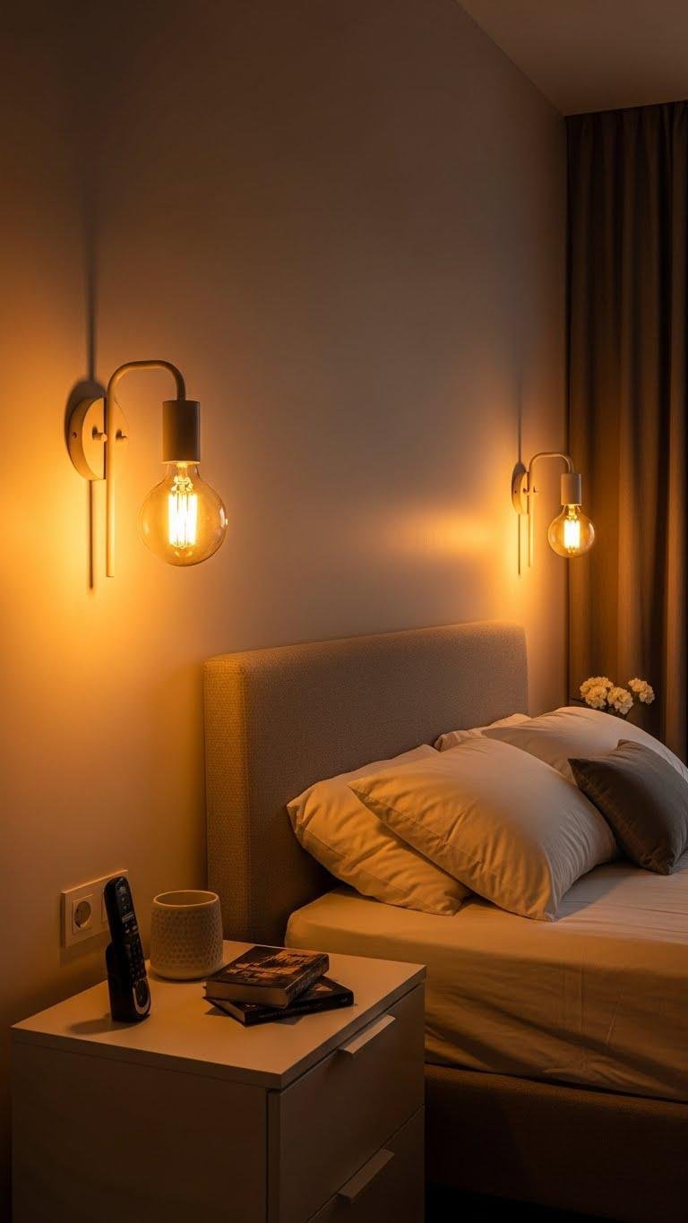 If you want a gentle, inviting glow that feels like a soft spring evening, install wall sconces with warm, dimmable bulbs to frame the bed and free up nightstand space.