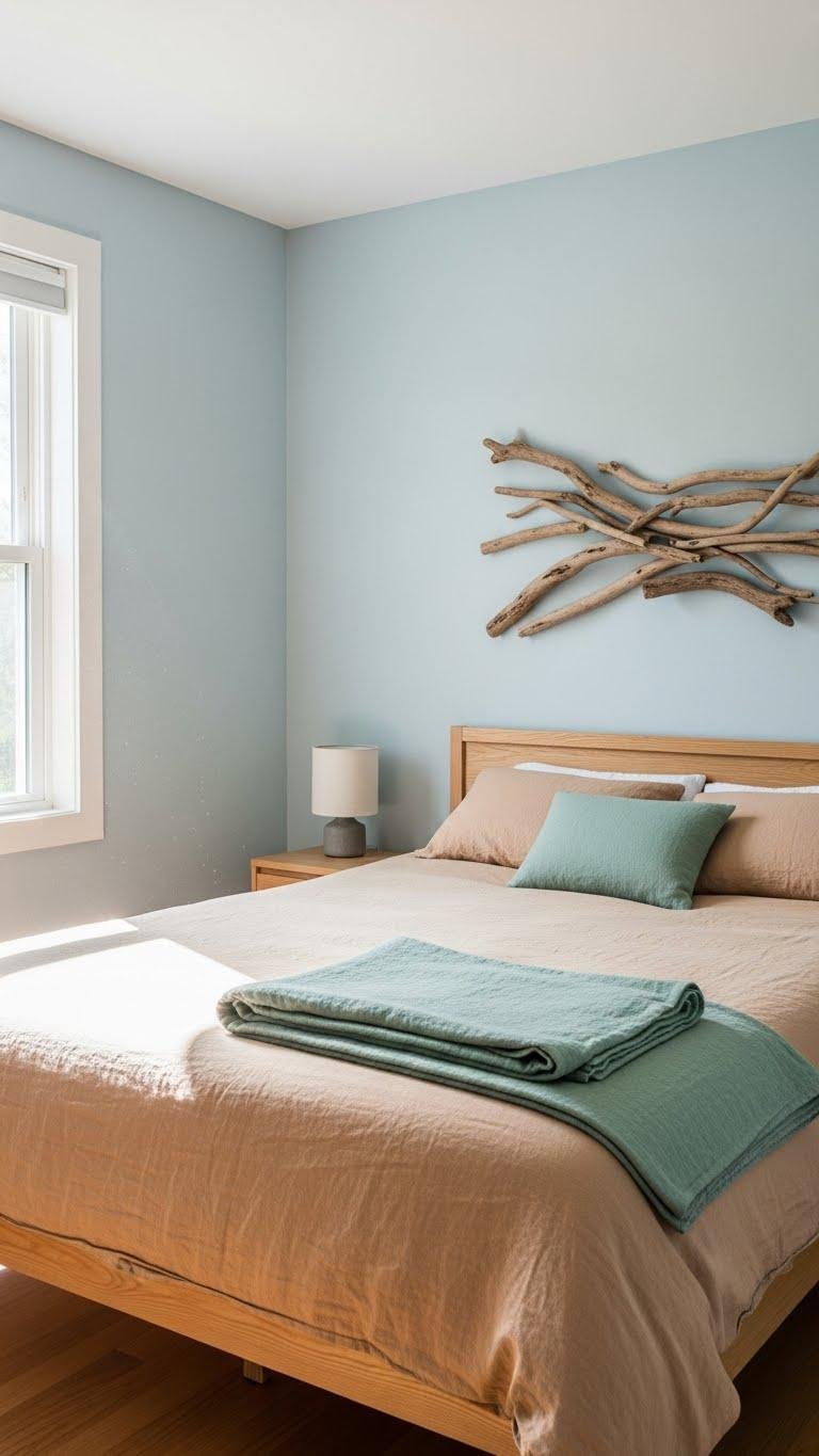 Although cool blues set a tranquil tone, pairing them with warm sand hues keeps the room from feeling cold. You’ll layer pale blue walls with a sand duvet, add a seafoam accent throw for pop, and place driftwood art above the bed to root the palette.