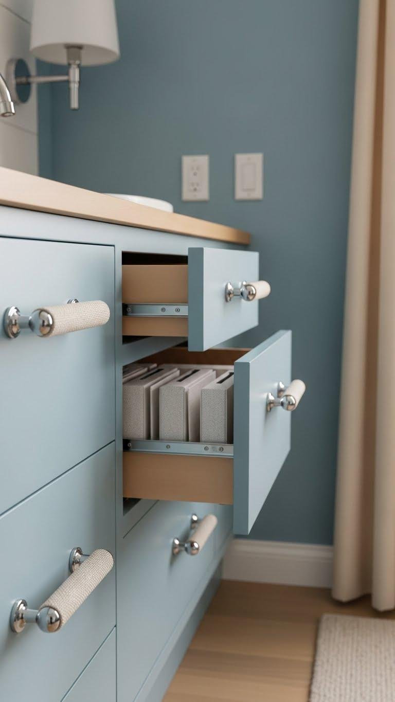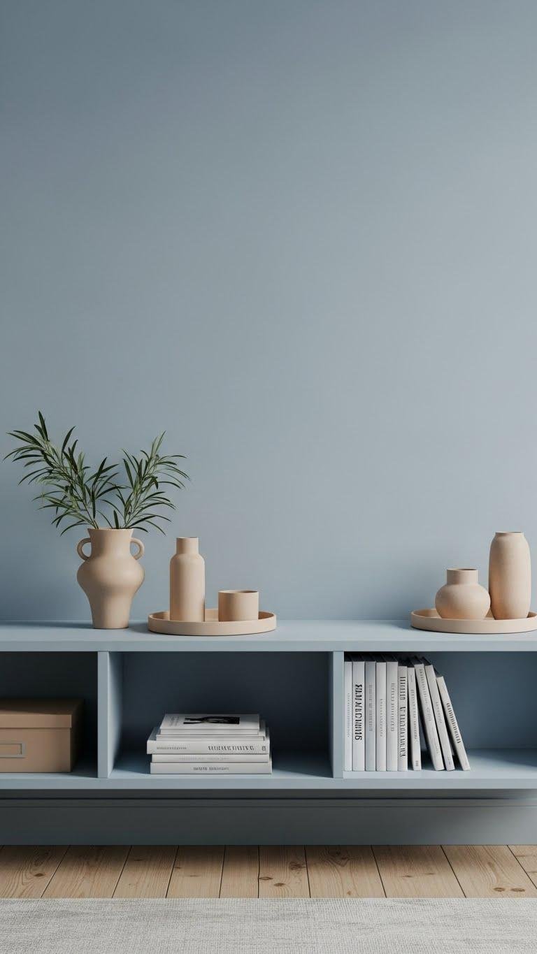 When you clear surfaces down to a few purposeful pieces, the room breathes and the blue-and-sand palette reads calm and intentional. Keep counters and dressers free: store extras, use trays for essentials, and limit decorative items. Favor open shelving with curated vases and books, choose minimal artwork, and let negative space highlight texture. You’ll feel lighter, freer, and more serene.