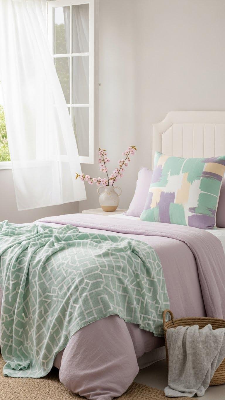 If you want a fresh, calming update, introduce soft pastels to set a gentle tone without overpowering the room. Choose pale mint accents on throws or a statement pillow, pair with blush lavender bedding or art, and keep walls neutral. You’ll create airy, liberated vibes that feel intentional yet effortless — swap small pieces seasonally to maintain freedom and easy change.