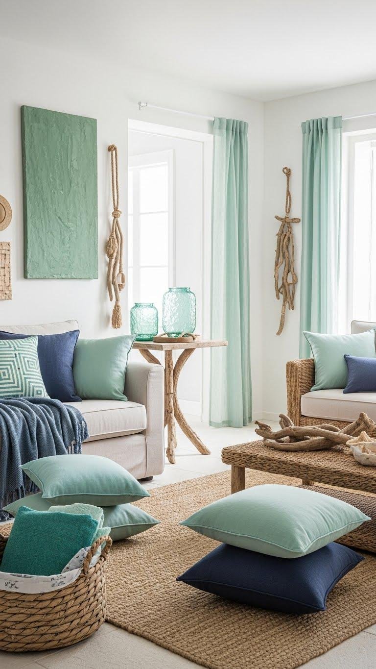 To build on that breezy coastal palette, introduce natural wood and rattan pieces to bring warmth and tactile contrast.
