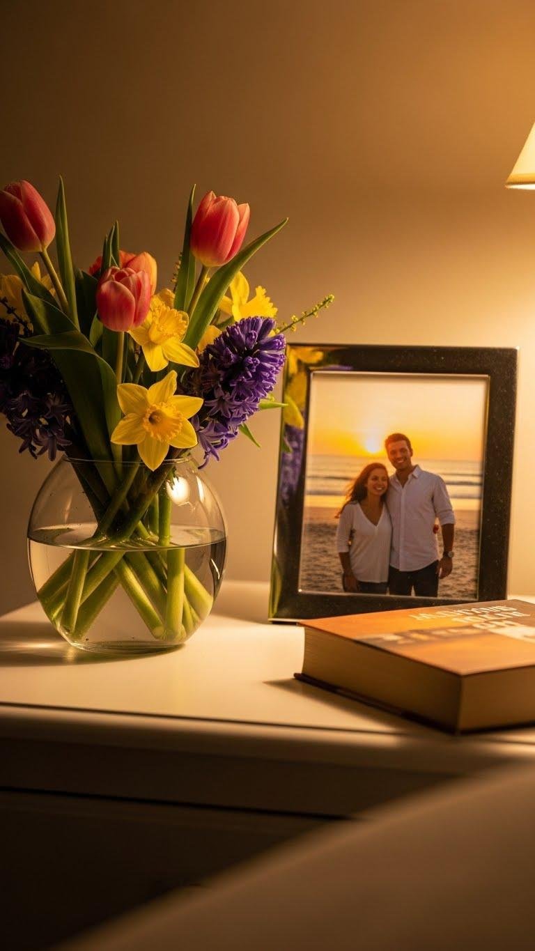 Freshen your nightstand with a small vase of seasonal blooms to add color, scent, and a lived-in, elegant touch. Place a seasonal bouquet in a low-profile vase, trim stems, and rotate water for longevity.