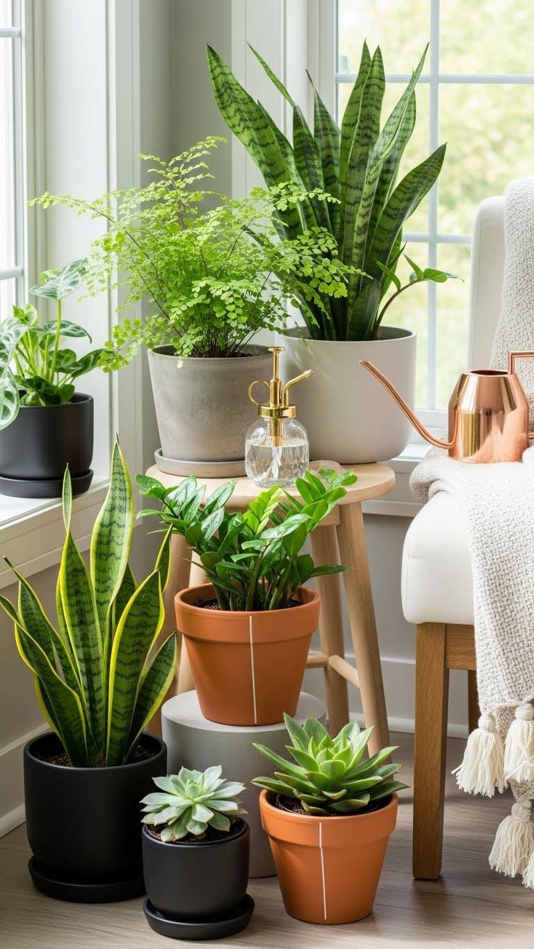Curate a cozy potted-plant corner that becomes your home’s green focal point: group plants of varying heights, textures, and pot styles to create depth and rhythm while keeping sightlines and light needs in mind.