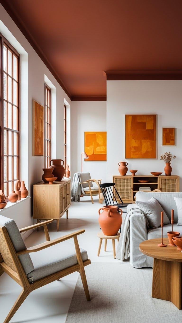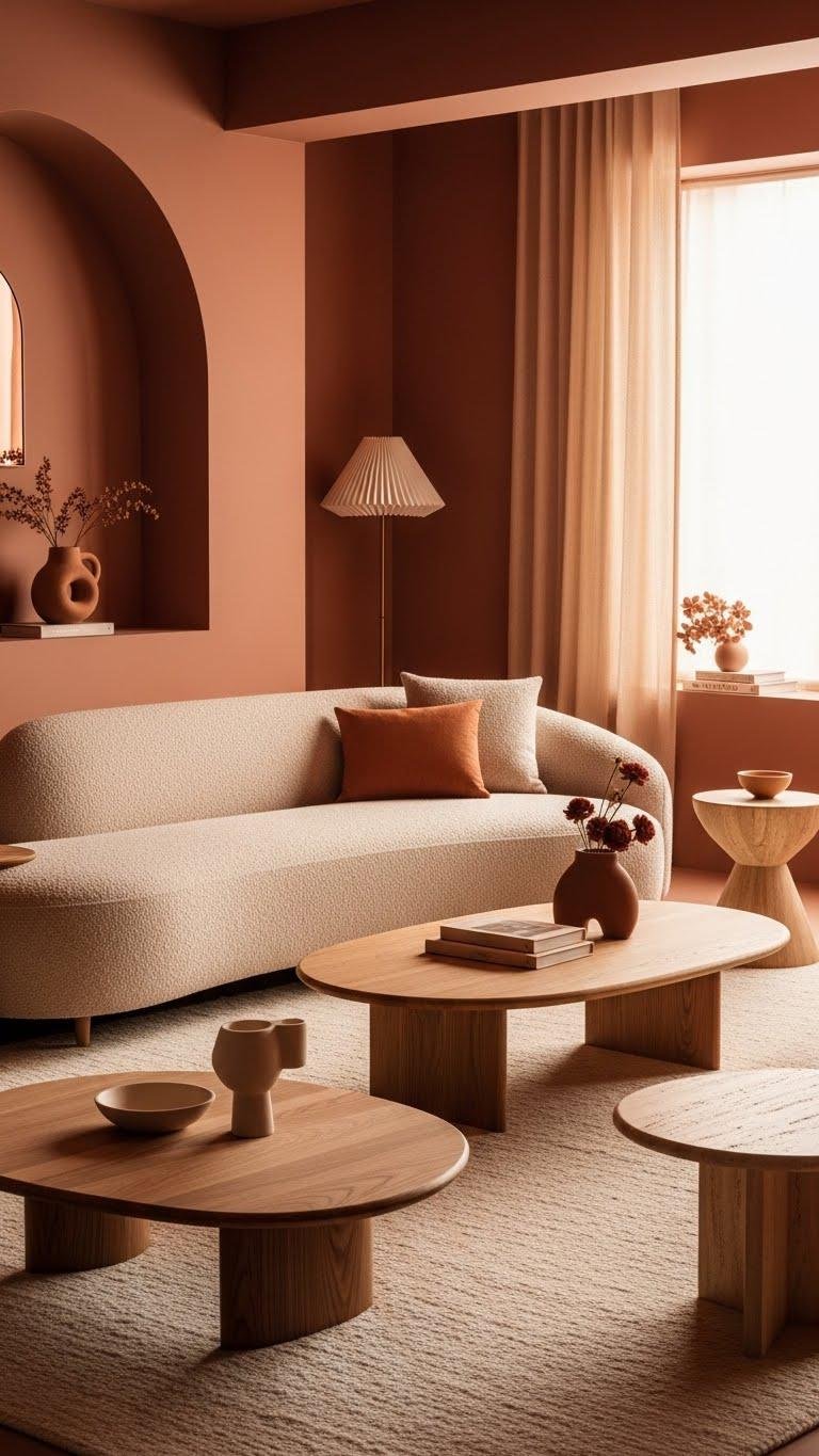 After grounding your palette in deep terracotta and ochre, soften the room’s silhouette by choosing curved sofas and organic furniture shapes that echo those earthy hues.