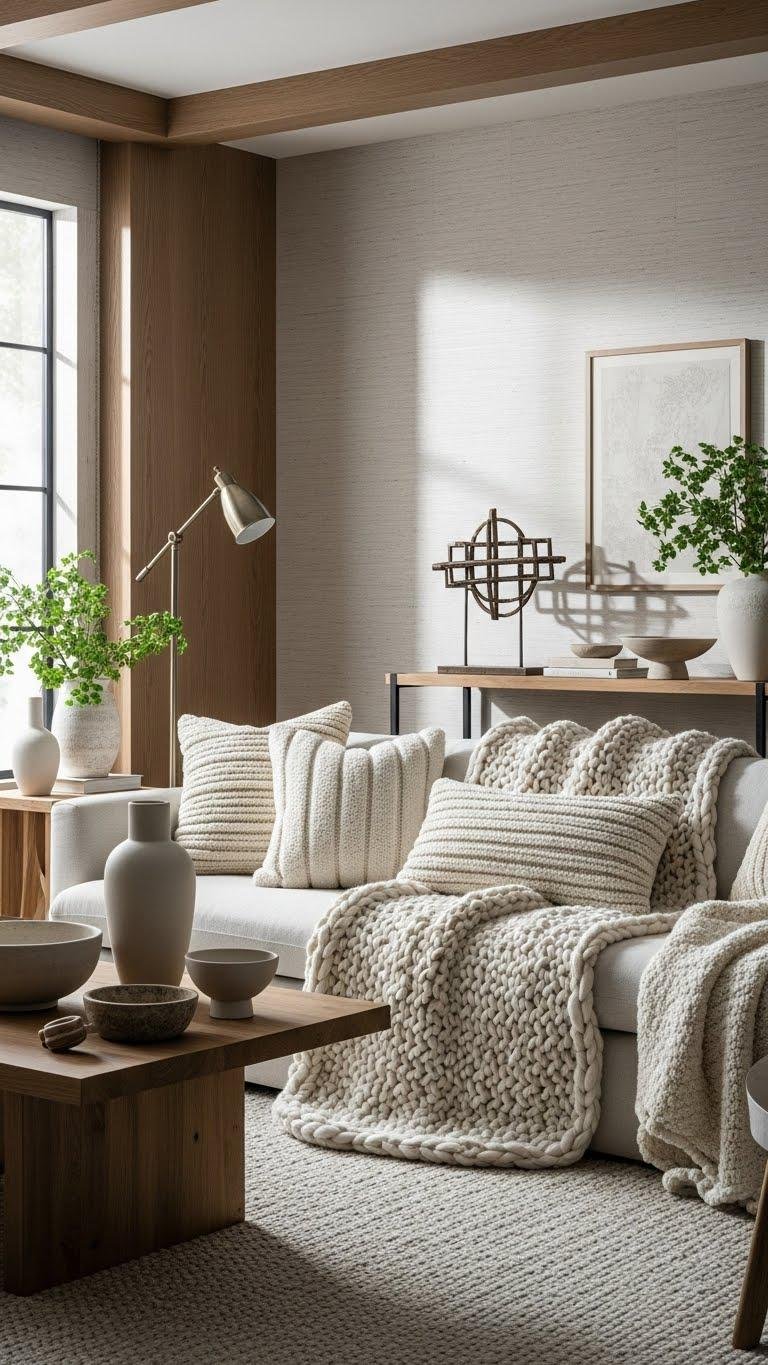 Woven textures and warm wood set a grounded backdrop; now bring in bouclé and other tactile finishes to amplify comfort and visual depth. Choose bouclé cushions for seating and layered throws that invite lingering.
