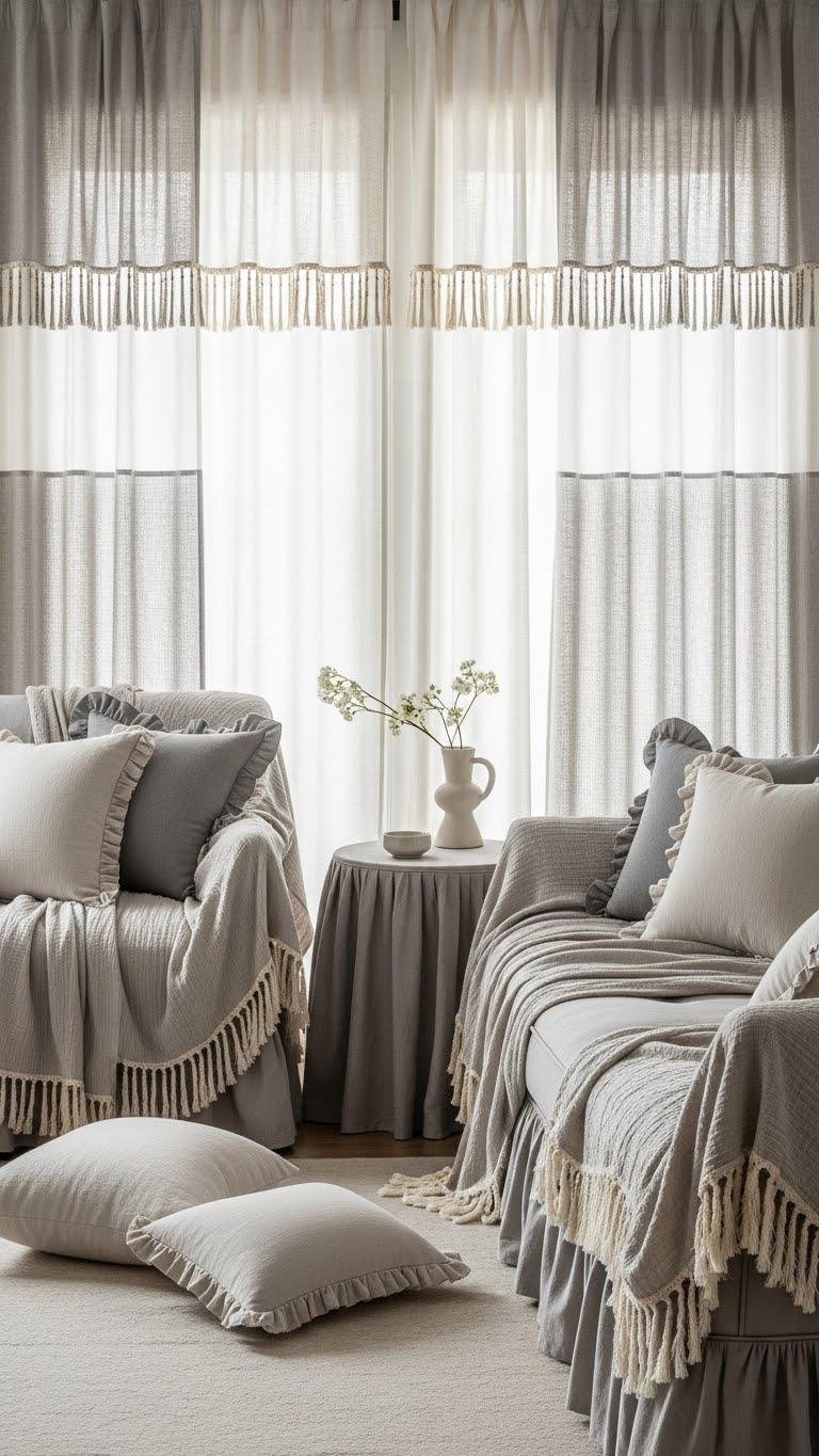 Bring in fringe, ruffles, and layered fabrics to add movement and soft detail that keeps the room feeling relaxed yet refined. You’ll use fringe layering on throws and curtains to create gentle motion, while ruffle textures on pillows and skirts introduce playful softness. Layer lightweight linens and gauze to build depth without weight, letting your space breathe and feel free, calm, and deliberate.
