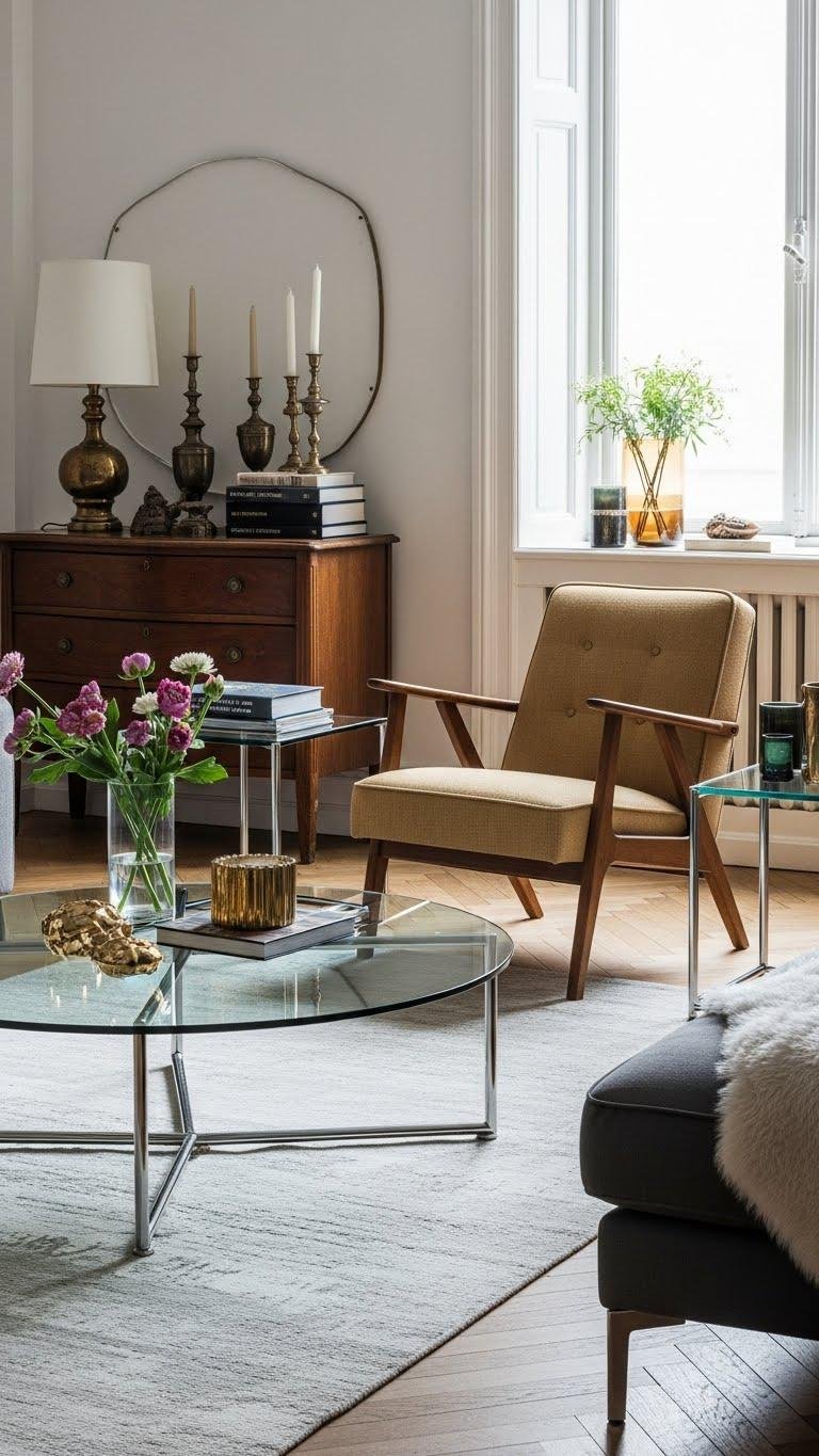 Embrace a midcentury mashup for effortless flow, choosing one statement vintage item and surrounding it with simple, airy contemporary pieces for liberated, calm living.