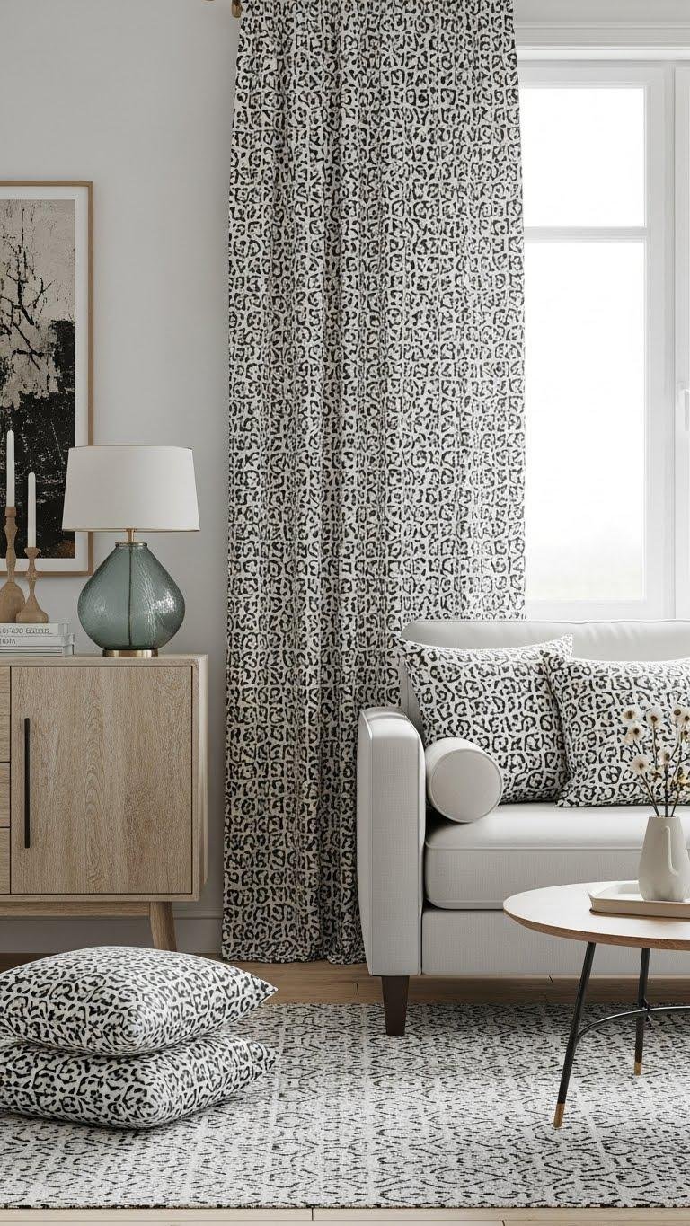 Let a repeat motif recur on pillows, a rug, and a single curtain, creating calm rhythm.