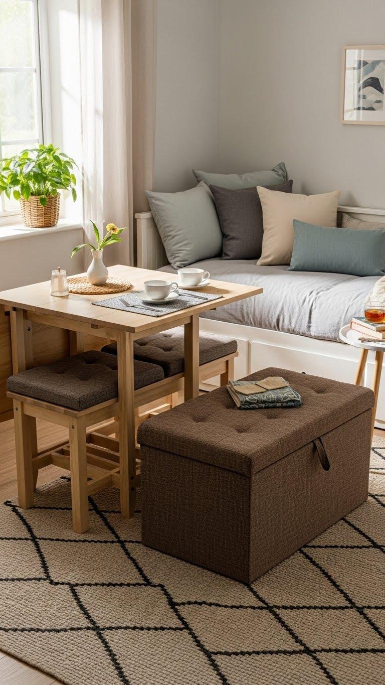 Carve out a cozy nook by choosing multifunctional furniture that does more than just fill space: opt for a storage ottoman that doubles as extra seating, a slim console with a drop-leaf for occasional dining, or a daybed with built-in drawers to keep clutter hidden.