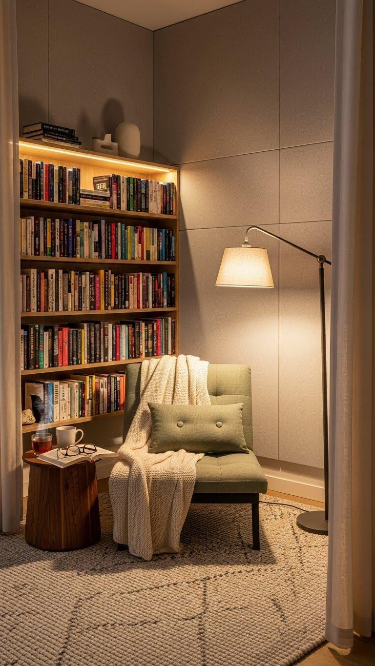 Define a reading nook with soft nook curtains, a slim shelving unit, and a low-profile chair. Add soundproof panels for quiet focus, a neutral rug to anchor space, and flexible lighting so you can retreat, breathe, and reclaim freedom within your home.