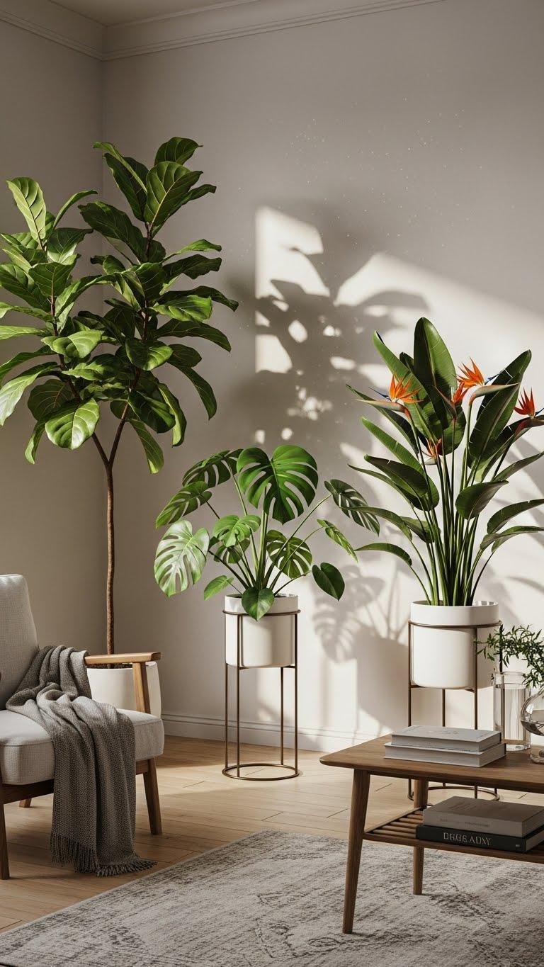 You’ll enjoy freedom to arrange bold greenery: group an oversized fiddleleaf in low light corners, elevate with refined plant stands, and let sculptural leaves define negative space for a serene, liberated atmosphere that feels deliberate yet effortless.