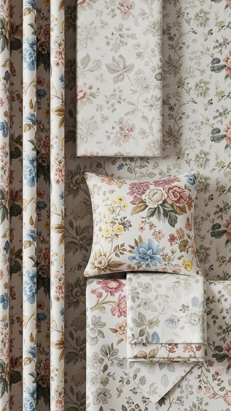 You’ll mix a soft bouquet on curtains or a cushion with ditsy overlays on throws, balancing scale, texture, and negative space so each piece breathes and freedom-infused calm emerges.