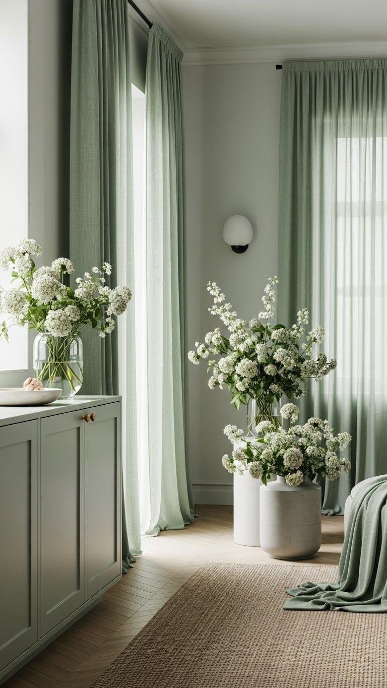 Layered florals settle beautifully into a pistachio-and-sage palette, so lean into those soft greens to amplify the calm you’ve created. Choose pistachio drapery to filter light gently and pair it with matte sage cabinetry for grounded warmth. Mix textures—linen, softwood, woven rugs—to keep the scheme airy yet anchored. You’ll feel freer in a space that breathes quietly.