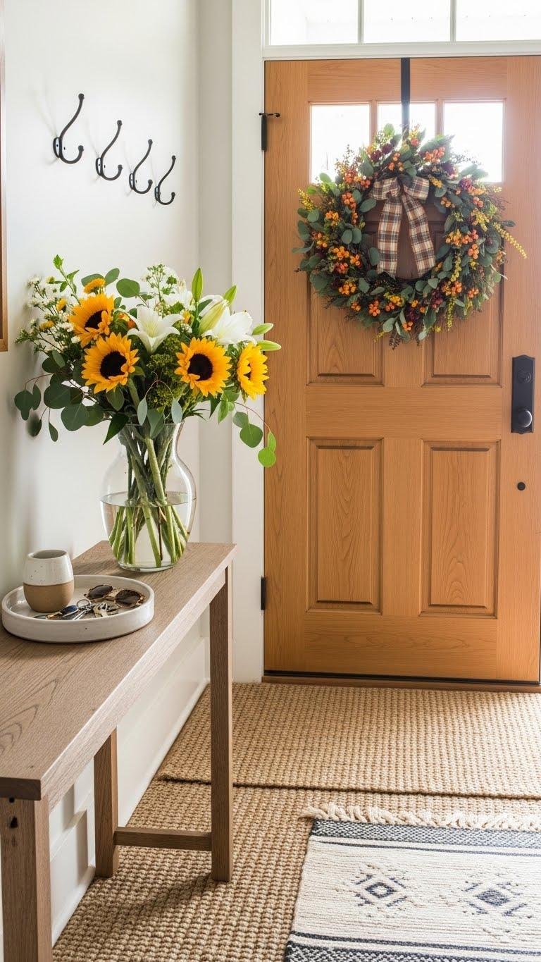 You’ll hang seasonal wreaths, swap clutter for a slim console, and add a vase of fresh stems.