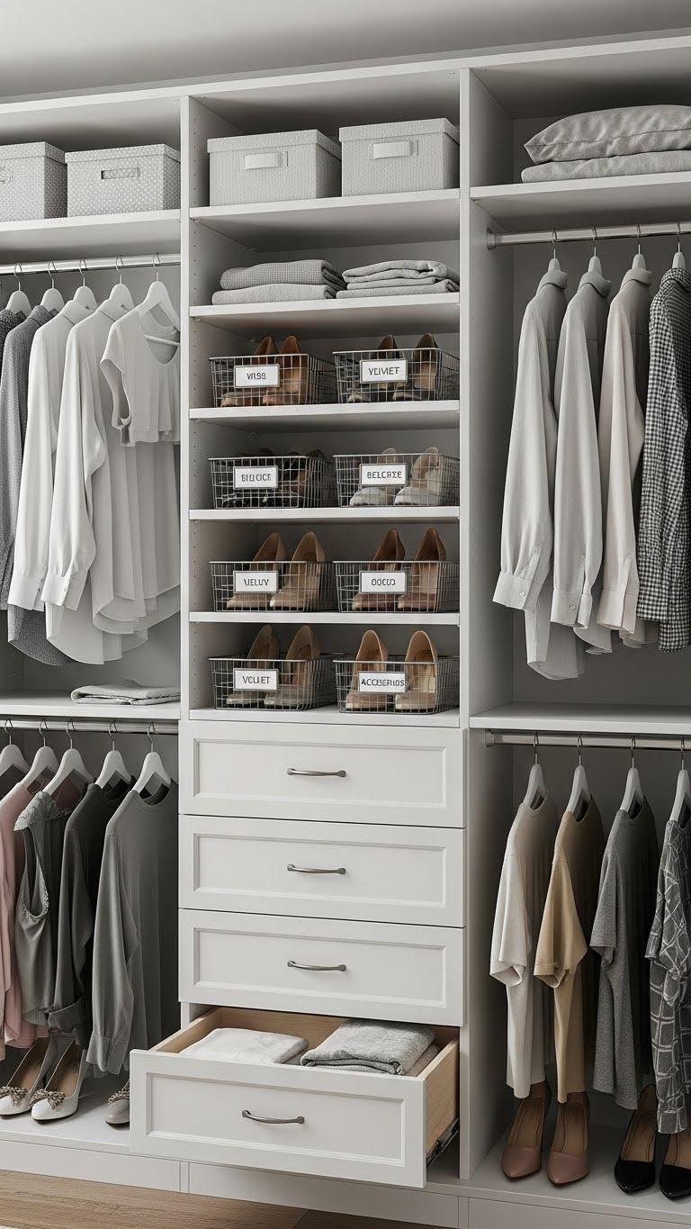 You’ll embrace simple systems: label baskets for shoes and accessories, velvet liners for delicate pieces, and open zones that free your routine so you grab, go, and feel unburdened each day.
