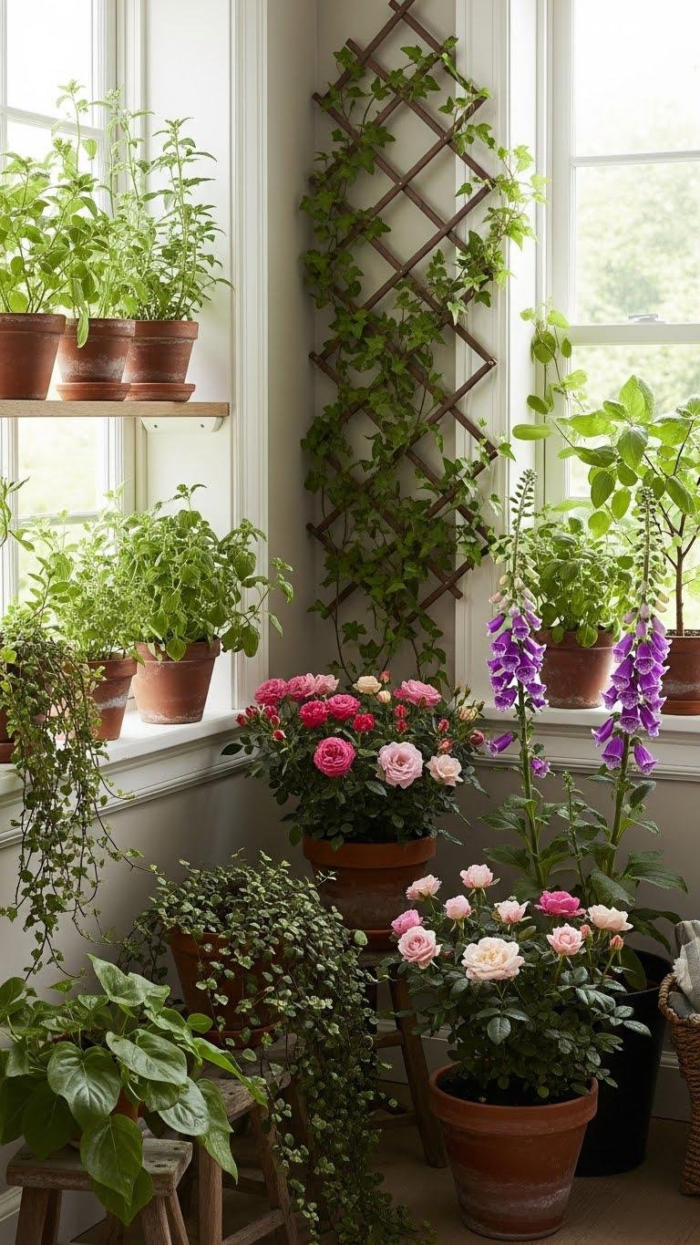 If you want a cottage garden vibe indoors, start by mixing leafy, flowering, and trailing plants to create layered, relaxed charm. Place window herbpots on sills for fresh scents, cluster potted roses and foxglove for color, and train an ivy trellis along a sunny wall. You’ll enjoy effortless greenery that feels free, lived-in, and fully yours.