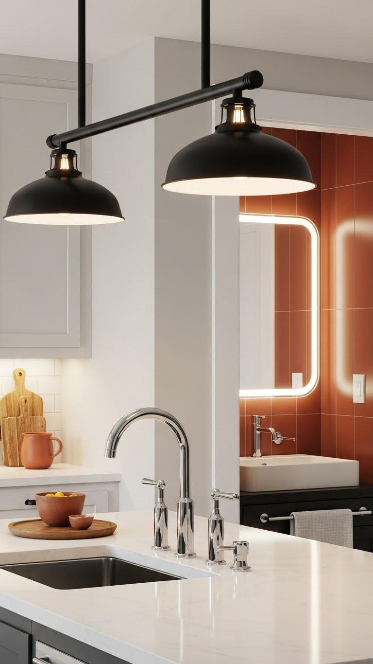 That terracotta accent sets the mood; now let the fixtures follow suit. Swap dated faucets and light fittings for modern polished chrome or bold matte black pieces to lift kitchens and baths instantly.