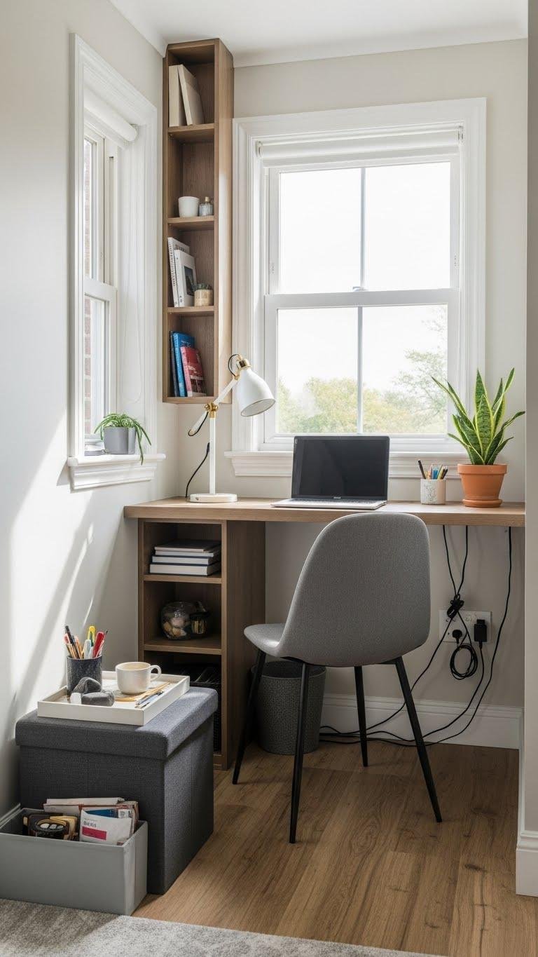 Choose a slim desk nook with built-in shelving, natural light, and a chair you love. Add a storage ottoman for hidden supplies and extra seating. Keep cables tidy, display one plant, and claim that liberated corner.