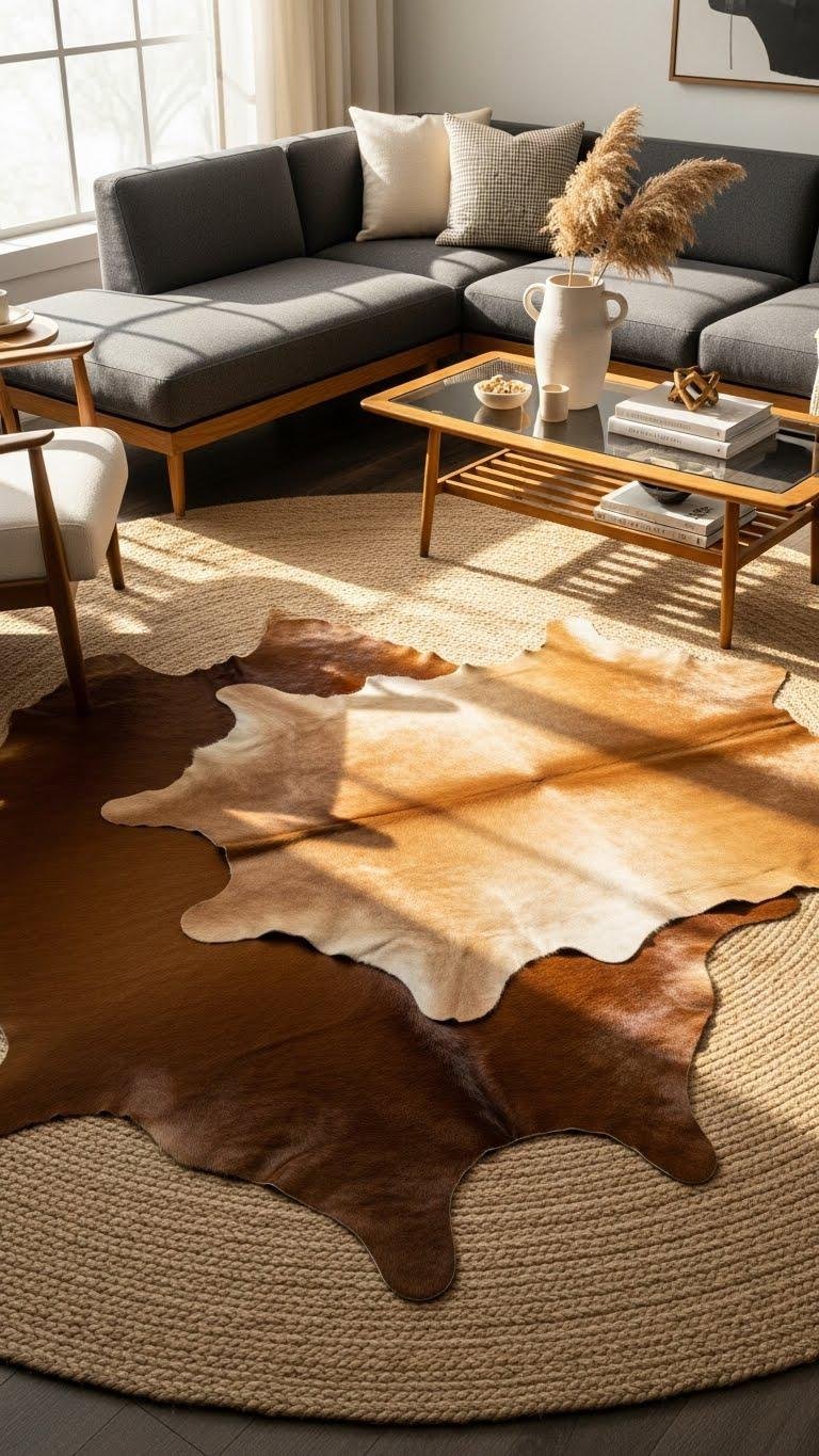 If silk and oriental rugs bring refined sheen and detailed motifs, jute and hide area rugs offer a contrasting grounded warmth that’s both modern and tactile. You’ll mix natural fibers with rustic leather hides to craft layered, liberated spaces. Choose textured weave and irregular hide shapes to anchor seating areas, balance sleek furniture, and evoke relaxed sophistication that feels intentionally unfussy and enduring.