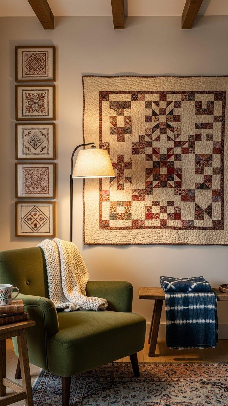 When you bring vintage textiles into view—hung, framed, or draped—they become the room’s storybook, gifting color, pattern, and tactile history at a glance. You’ll showcase antique quilts as focal art, mixing scale and patina against modern lines. Display embroidered samplers in slim frames or on open hooks to celebrate craft, letting layered textiles lend warmth, personality, and liberated charm to your space.