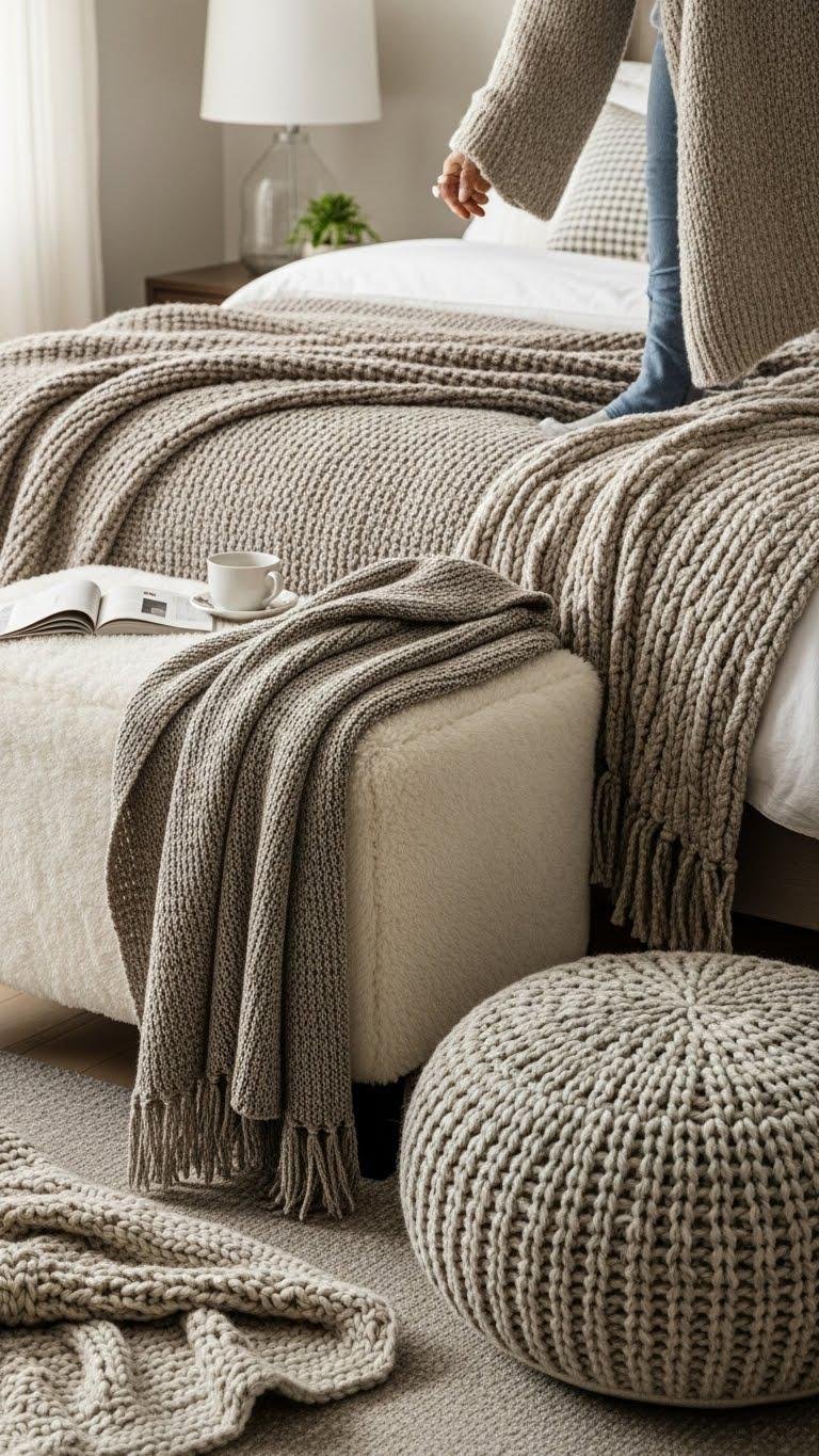 Against a backdrop of soft lighting, layer faux fur and chunky knits to create instant warmth and tactile contrast. You’ll drape a faux shearling ottoman with a slouchy throw, tuck a wool braided pouf at the bed’s foot, and mix nubby throws, ribbed blankets, and soft pile rugs. You’ll choose neutral tones and free, relaxed arrangements that invite touch and movement.