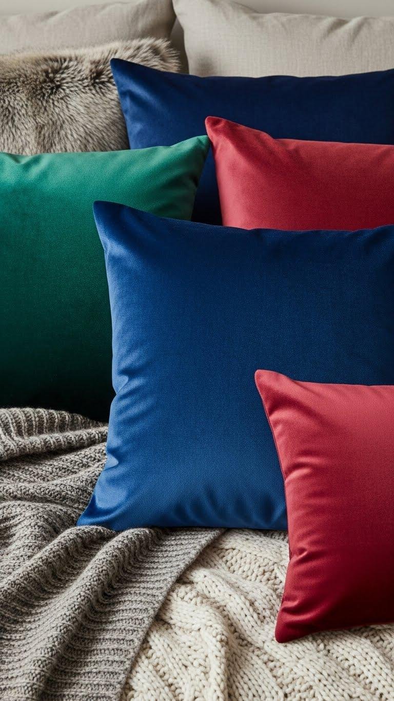 Introduce jewel-toned velvet pillows to punctuate your neutral winter bedscape—think emerald, sapphire, and deep ruby that catch the light and read plush against faux fur and knit textures. You’ll choose pieces with a plush sheen that invite touch and create jewel contrast against linen and wool. Arrange them sparingly for bold color pops, keeping shapes simple so freedom and warmth remain central.