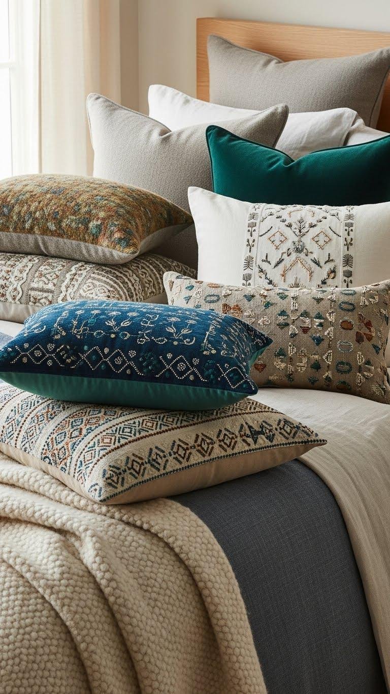 Layered cushions mix tactile contrasts—think nubby wool, smooth velvet, and crisp linen—to give your bed depth and a hands-on invitation. You’ll combine hand stitched accents with a linen blend cushion, add an eco friendly sheeting fabric, and vary scale and color for freedom-loving flair. Arrange larger neutrals behind smaller patterned pieces so texture reads loud, not cluttered.