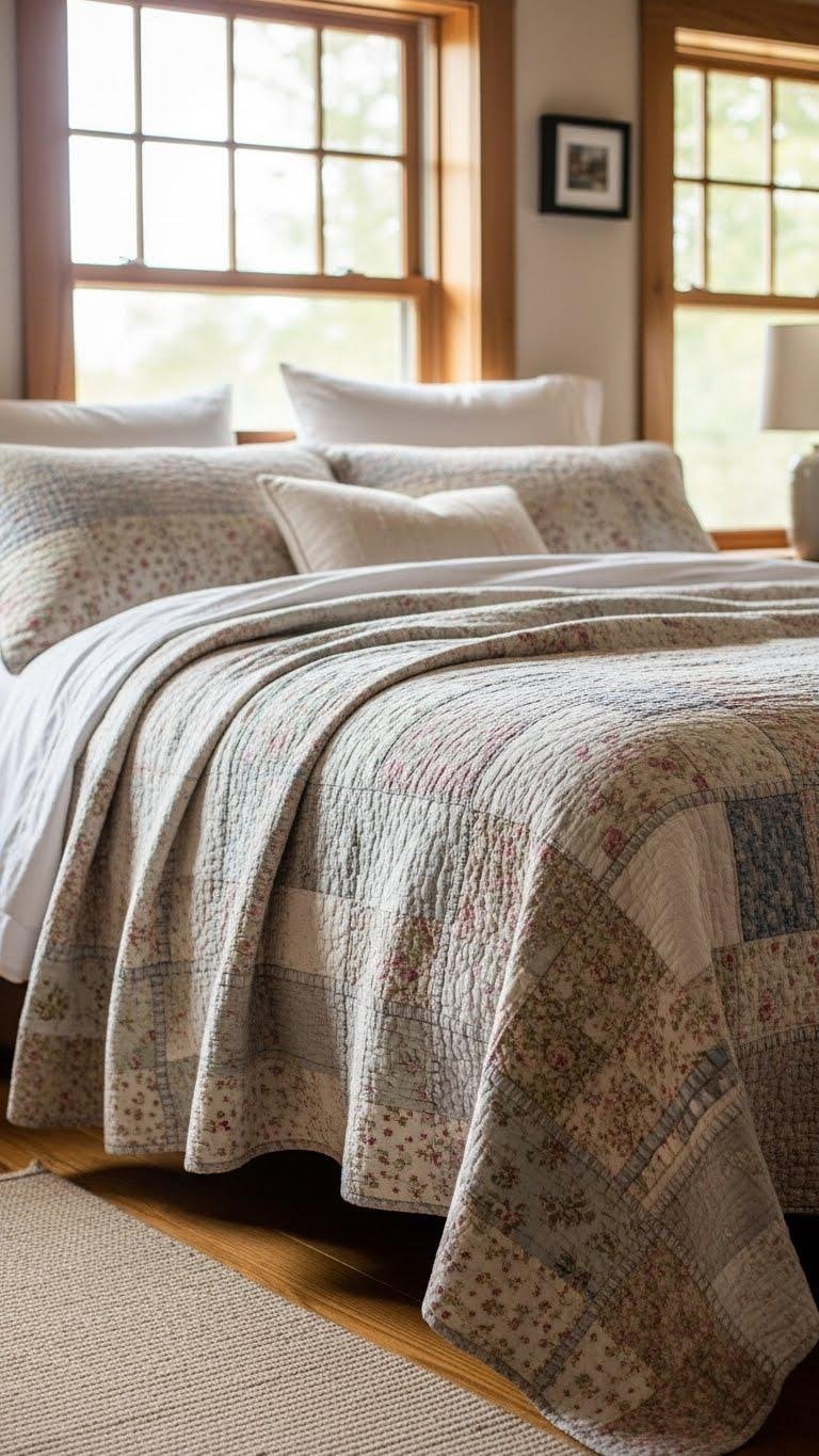 After arranging your cushions, bring a patchwork quilt in to anchor the bed with country warmth. You’ll choose hand stitched seams, faded vintage florals and heirloom fabrics that tell stories. Drape pastel patchwork across the footboard, let corners tumble free, and invite open windows and barefoot mornings. The look feels unconfined, tactile, and quietly resilient—simple freedom woven into sleep.