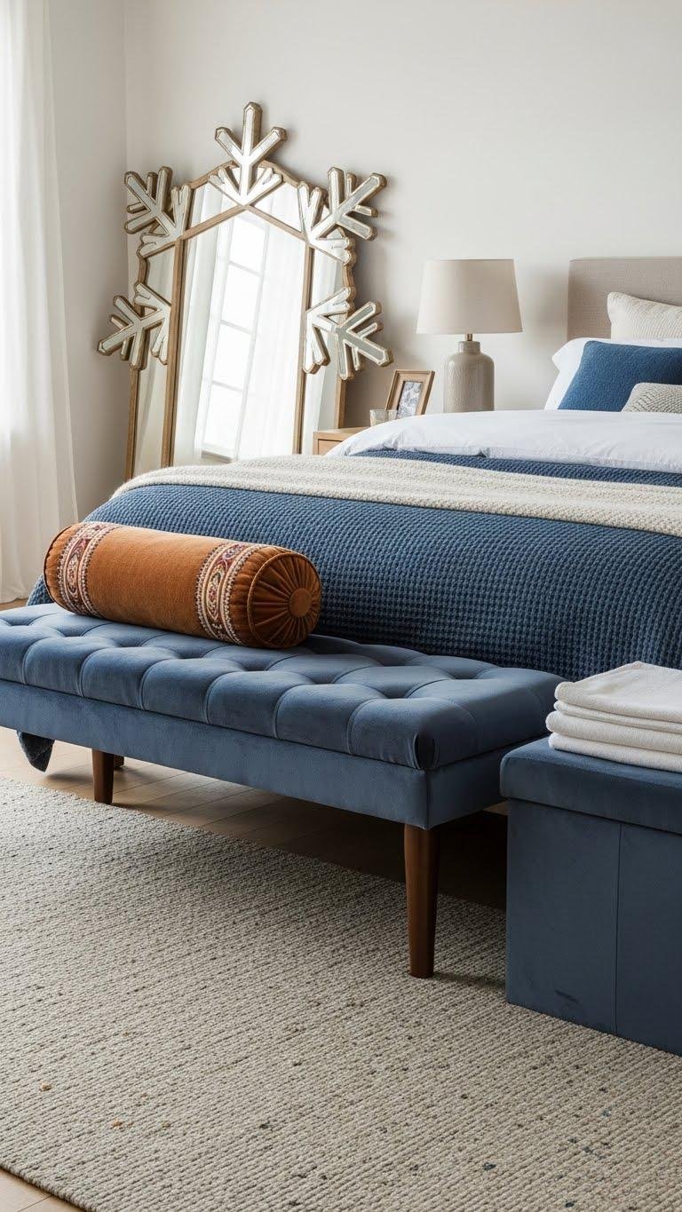 The snowflake mirror invites a tactile response—now anchor that chill clarity with a warm, low-slung velvet bench at the foot of the bed. You’ll pick a saturated jewel tone; the soft pile begs touch. Choose a storage ottoman for hidden linens and a vintage bolster for relaxed, nomadic charm. It frames the bed, grounds movement, and keeps the room open to possibility.
