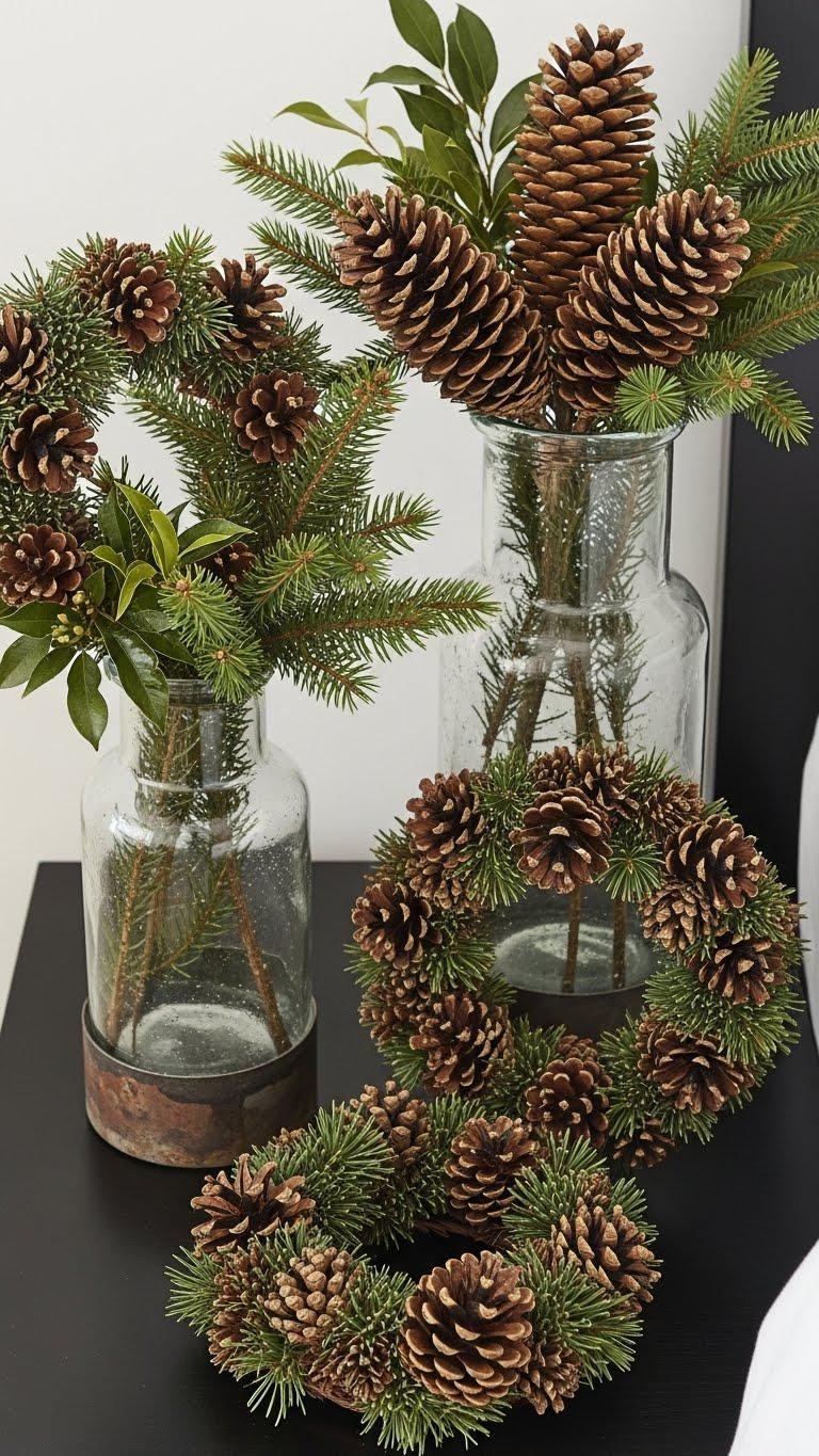 You’ll place textured cones, brittle brown and matte, beside glossy evergreens, trimming stems to fit reclaimed glass or metal.