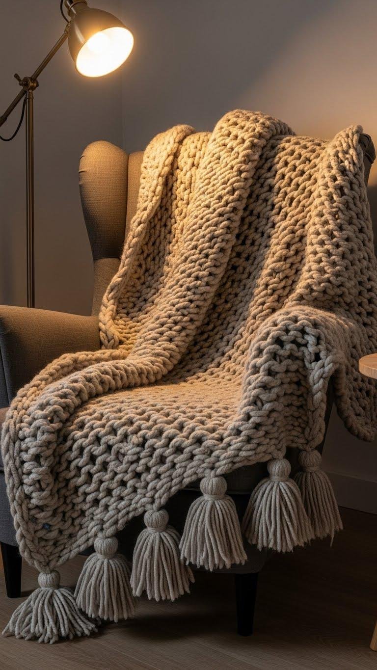 Draped over a chair, a chunky knit throw instantly softens the room and signals cozy downtime; you’ll want a heavy-weight yarn in natural wool or a wool blend so the texture reads as tactile from across the room.