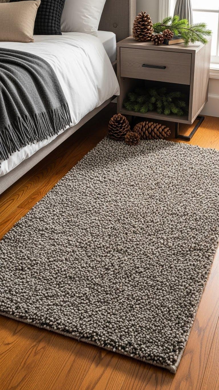 After anchoring your bedside with pinecones and evergreens, layer in a shaggy runner to warm hardwood floors and pull the look together.
