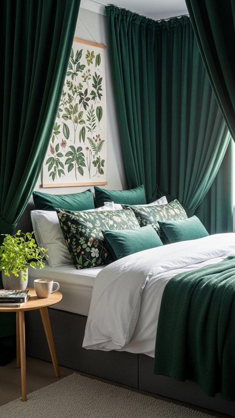 You’ll choose heavy emerald textiles to block cold and shape light, pairing them with crisp sheets and occasional botanical prints for contrast.