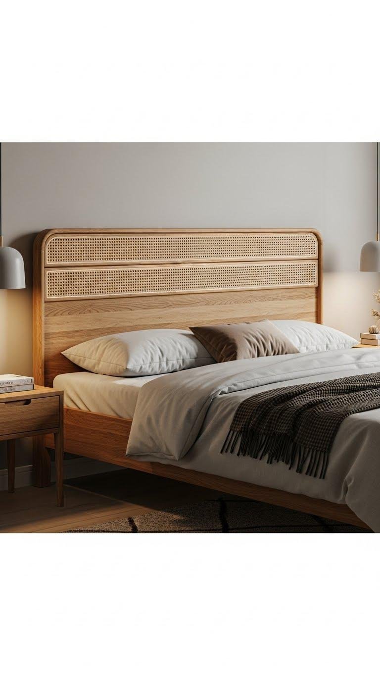 You’ll love the rattan contrast against warm oak, the textured grain catching low light. Keep bedding simple, let natural tones breathe, and choose slim profiles so the headboard feels freeing, tactile, and quietly sculptural without overwhelming the room.