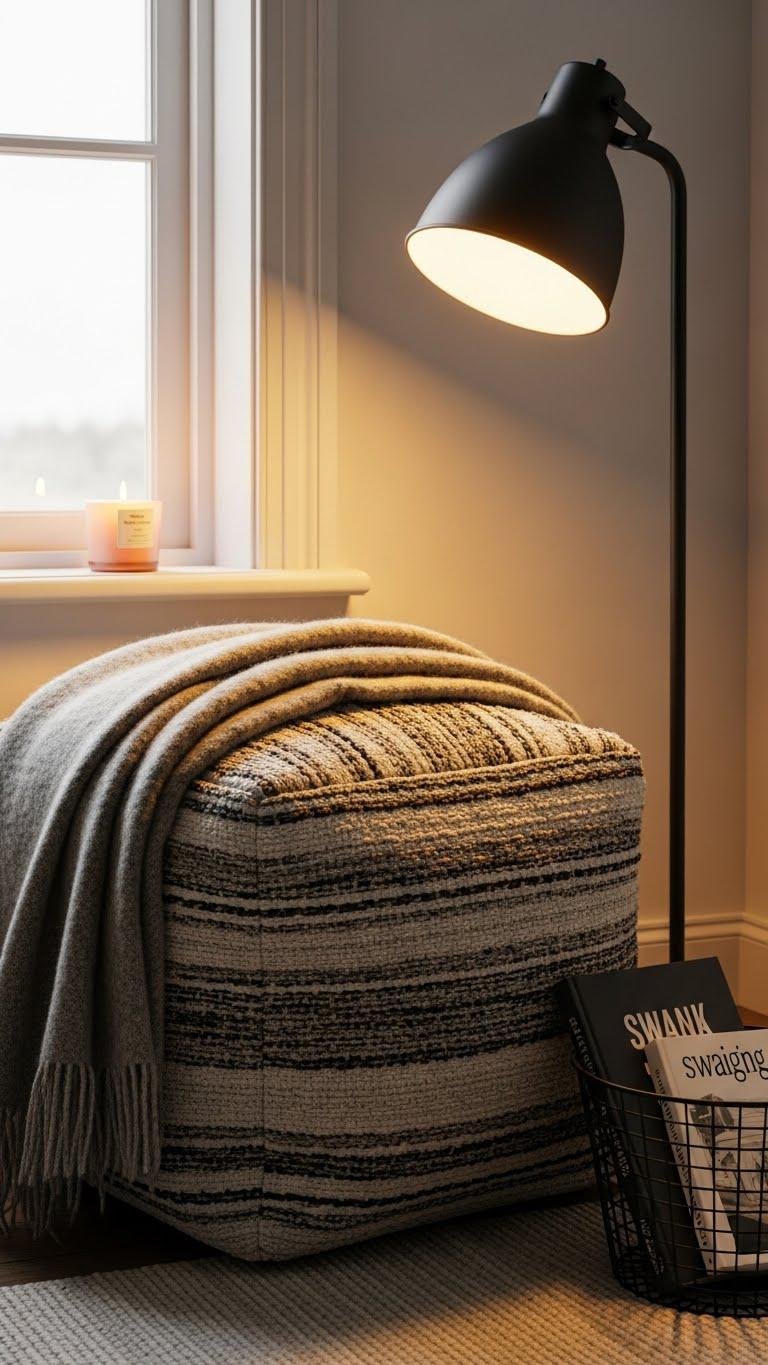 You’ll choose a textured pouf with ottoman storage, layer a wool throw, and position a dimmable lamp.