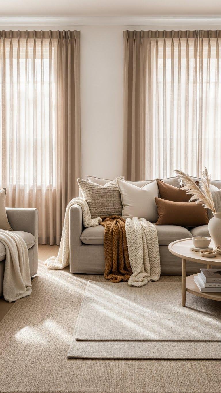 You’ll swap flat neutrals for warm beige and soft taupe with cream undertones, layering textured textiles and wood accents to cultivate muted warmth that lets your rooms breathe and invite ease.