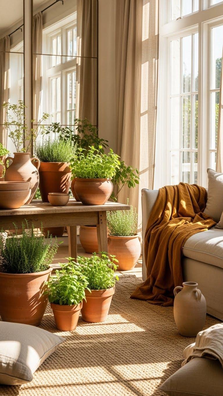 Often you’ll find that clay tones come alive when you let daylight do the heavy lifting: position terracotta pots, muted ochre textiles, and matte earthenware where morning and late-afternoon sun can wash them in soft, golden light.