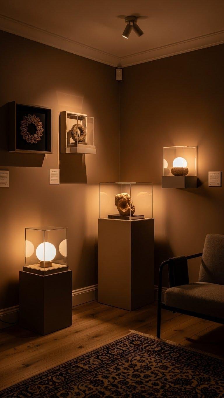 Draw attention to your favorite objects with targeted accent lighting that sculpts form and deepens the room’s clay-toned warmth. You’ll use gallery lighting and beam grazing to define textures, while shadow sculpting adds drama without clutter.