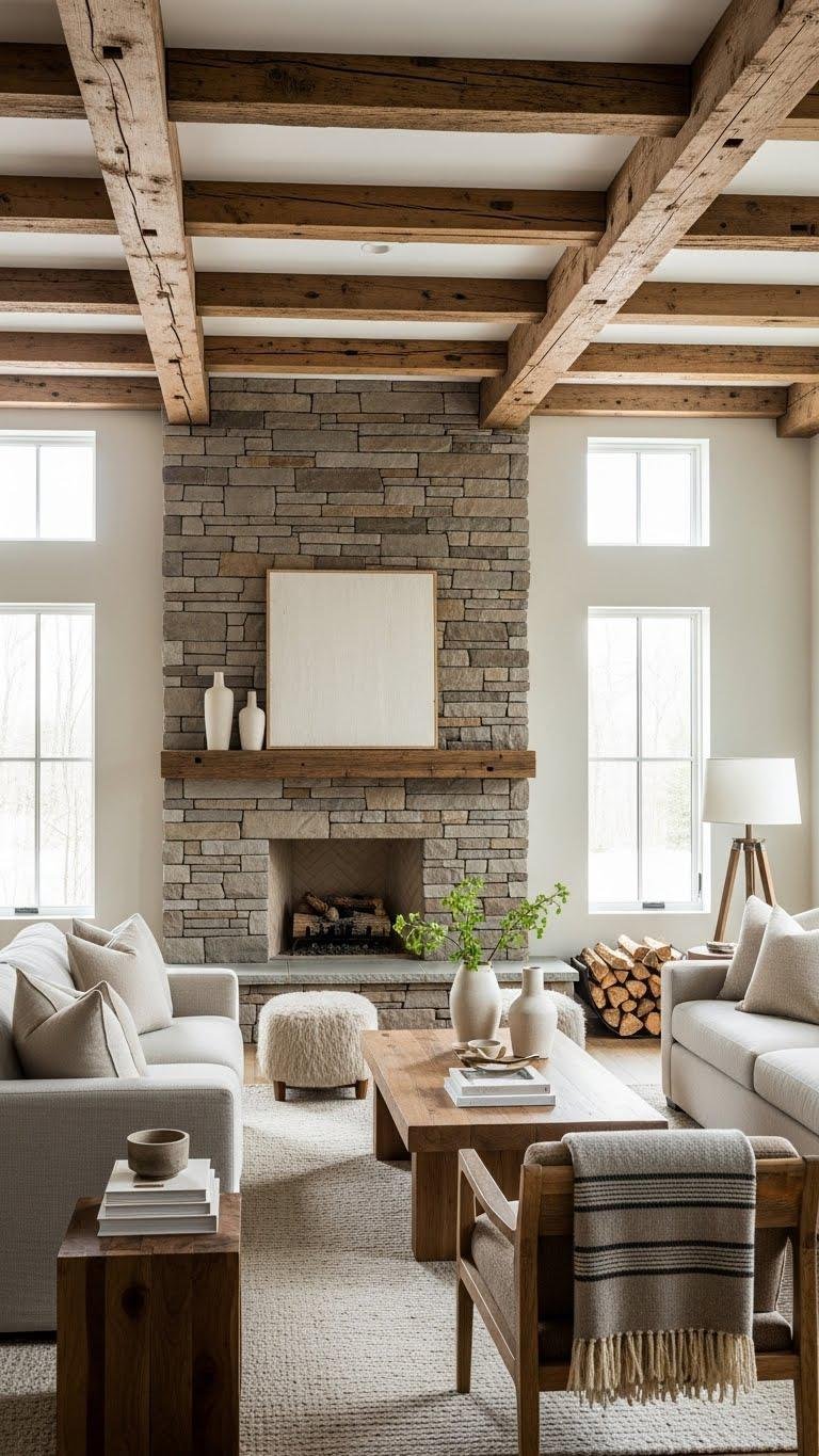 Reclaimed wood-and-stone pairing brings instant character and lived-in warmth to a modern interior, letting you anchor a room with materials that carry history and texture. You’ll add reclaimed beams for sculptural rhythm and tactile appeal, pair them with low, cozy stone hearths, and keep finishes matte and natural.